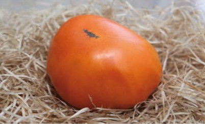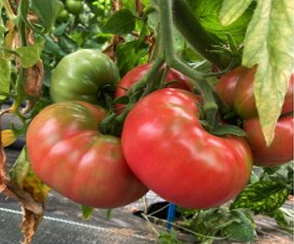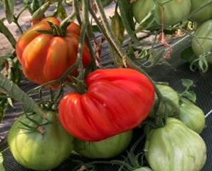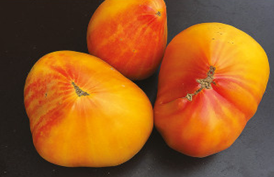 Croissance indéterminée. Gros fruit pouvant atteindre 1 kg. Couleur orange, voilée de rouge, forme irrégulière mais côtelée sur tout le corps. Arôme exotique rappelant l’ananas. Très grande productivité