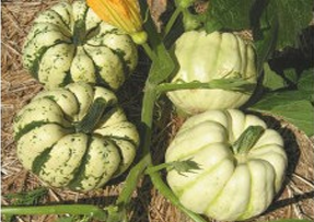 Type pepo. Variété semi-coureuse. Cycle de 100 jours. Petite courge blanc crème striée de vert, d'environ 500 à 800 g. Chair jaune au goût fin d’amande et dechâtaigne. Cuite, elle est consommée aussi en dessert. Production de 8 à 15 fruits par pied. Conservation : 3 à 6 mois.