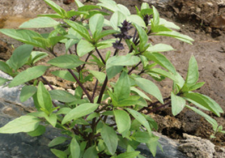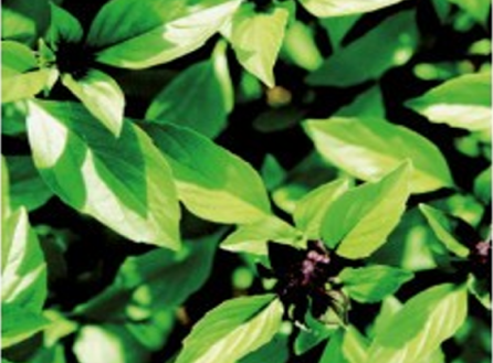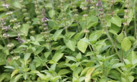Plante sacrée en Inde. Les feuilles sont vertes dentelées et le port Plante sacrée en Inde. Les feuilles sont vertes dentelées et le port buissonnant. Les fleurs sont mauves et le pollen est d’un très beau rouge. Plante très odorante à la saveur épicée et fruitée. S’utilise beaucoup en infusion et sirop. Possède de nombreuses vertus.