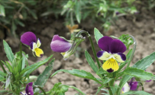 Fleurs tricolores (blanches, jaunes et violettes) groupées en petites touffes compactes. Feuillage vert foncé très découpé et disposé en rosettes. Les fleurs sont comestibles. Plantation mi-ombre. Hauteur de