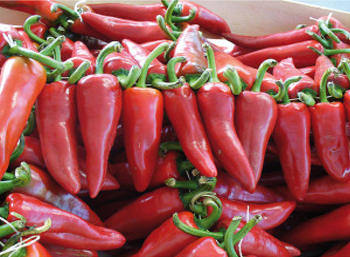 Des Basques partis à la conquête du Nouveau Monde ramenèrent le piment “Gorria” (rouge en Basque). Plante de 1 m de haut, jusqu’à 15 fruits par pied (environ 500 g de fruits). Fruit rouge de forme conique de